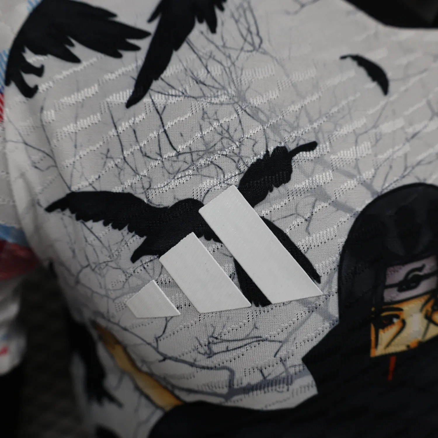 Anime Crossover: Features the character Itachi Uchiha fromNaruto, surrounded by crows and set against a stylized forest backdrop. Blends football jersey aesthetics with anime culture.