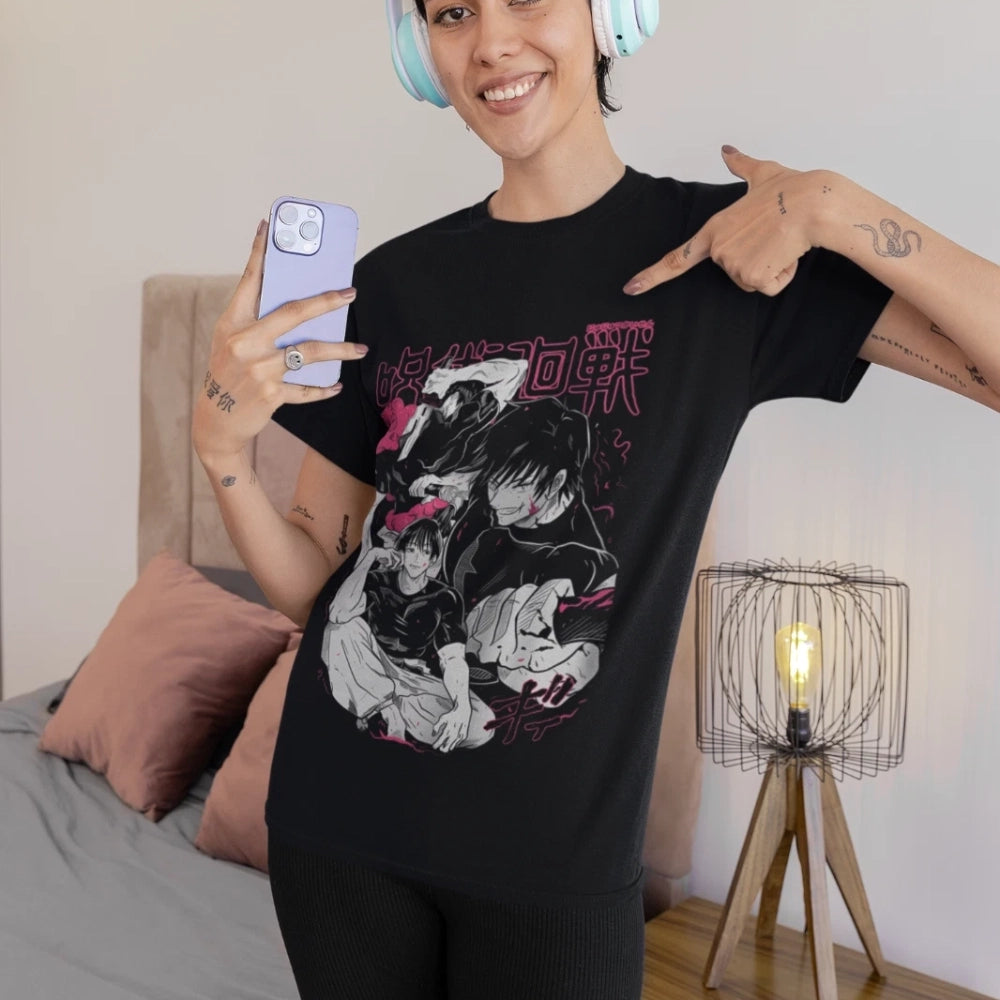 This tee is a love letter toJujutsu Kaisenfans, featuring a bold collage of iconic characters: Toji Fushiguro’s ruthless aura, Gojo Satoru’s gravity - defying cool, Sukuna’s menacing presence, and Geto’s enigmatic vibe. Each character is rendered in crisp, vibrant detail — from Gojo’s Six Eyes to Sukuna’s tattoos — capturing their essence in every line.